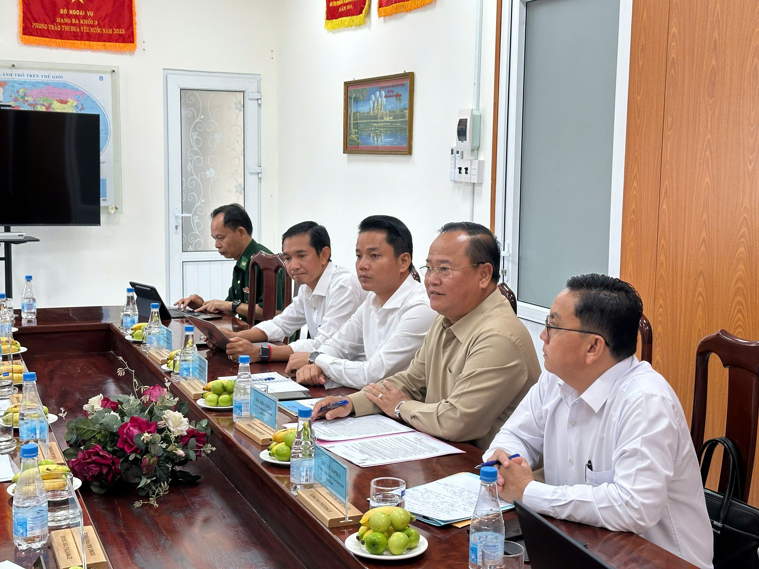 Tiếp và làm việc với đoàn có bà Huỳnh Thị Bé Năm – Giám đốc Sở Ngoại vụ, cùng lãnh đạo một số cơ quan, đơn vị: Văn phòng UBND tỉnh, Ban Quản lý các Khu Công nghiệp, Khu Kinh tế tỉnh, Sở Công Thương, Bộ Chỉ huy Quân sự tỉnh, Ban Chỉ huy Bộ đội Biên phòng tỉnh, Ban Quản lý cửa khẩu Quốc tế Hoa Lư.