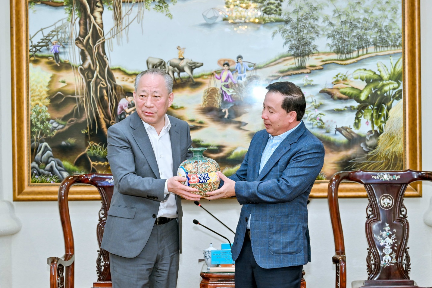 Chủ tịch UBND tỉnh Nguyễn Văn Út tặng quà lưu niệm cho ông Nghiêm Giới Hòa